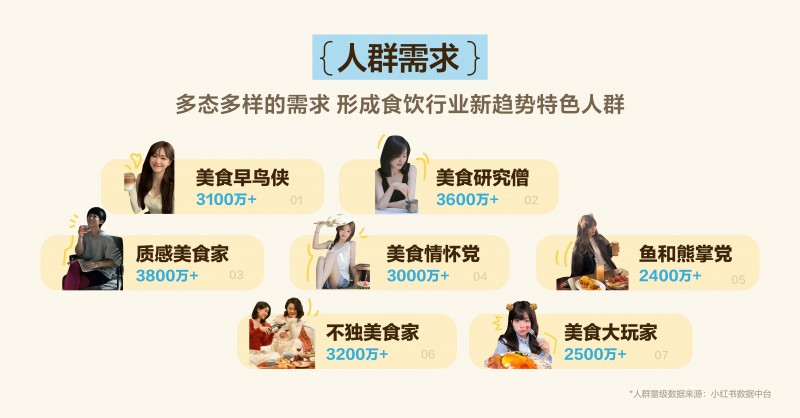 此外,基于食饮消费者的多元需求,小红书总结出食饮行业七大新趋势特色人群——美食早鸟侠、美食研究僧、质感美食家、美食情怀党、鱼和熊掌党、不独美食家、美食大玩家。