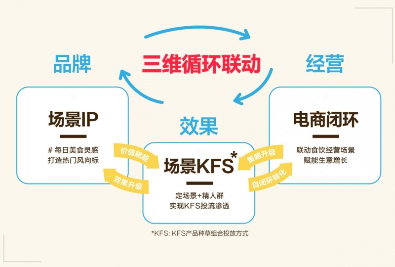 此外,品牌借助KFS场景反漏斗模型可以精准定位目标人群,高效实现内容的渗透和反馈;最后借助“场景电商闭环”实现营销赛道的全方位赋能,激活更多品牌增长机会。品牌、营销效果与商业经营的三维循环联动,为品牌的长远发展奠定了坚实基础。