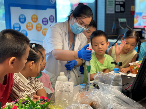 图为小朋友体验餐厅食材现场快速检测过程。