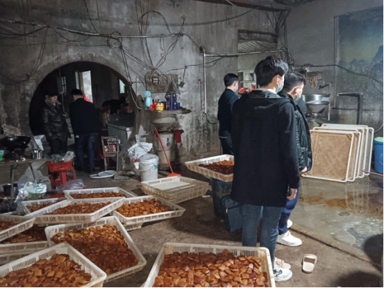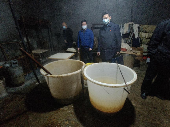 检查发现,正在加工间内制作香干的人是来自湖北的周某夫妻二人,他们去年11月开始在此租赁民房一楼进行豆制品加工。加工间室内昏暗,墙壁发黑,房顶是用积满灰尘的彩条布遮挡着,地上污水四流,盛装豆制品的塑料器皿污迹斑斑,加工用具随意挂在墙上,或横七竖八放在地上,10多个镂空塑料筐装着做好的豆腐摆在了积满污水的底板上。且加工间内没有任何防鼠防蝇防虫设施,操作人员穿着随意,没有穿工作服、戴口罩、手套等。整个作坊场面脏乱不堪,弥漫着一股难闻的异味。据周某交代,该小作坊日产豆制品约100公斤,主要销往资阳区桥北几家大型农贸市场。