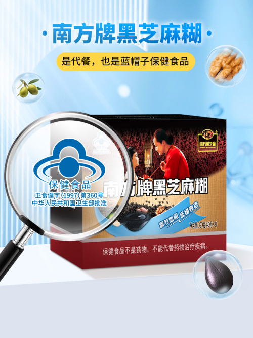 南方牌保健款黑芝麻糊比市面上普通黑芝麻糊香气更浓郁、口感更细滑,更适合中老年人和高血脂消费者食用。其延缓哀老、调节血脂等保健功能相关的原料主要是黑芝麻,其中含有具多种生物活性的物质黑芝麻色素、亚麻酸、维生素D,另外还添加了核桃仁、花生仁、橄榄仁等果仁类食材,含有较为丰富的微量元素硒以及不饱和脂肪酸特种蛋白质等等。之所以更适合中老年人,不仅在于其养生功效,还在于其适口性和易消化性,这对于中老年人来说尤为重要,有助于减少不适感和肠胃问题。