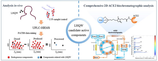 厦门大学吴彩胜教授联合海军军医大学柴逸峰教授团队在连花清瘟防治新冠肺炎药理活性成分研究方面取得新进展,基于高分辨质谱(HRMS)和智能非靶向数据挖掘以及全新的血管紧张素转化酶2(ACE2)生物色谱技术,成功鉴定体内连花清瘟85个相关成分,其中苦杏仁苷、野黑樱苷、甘草酸、连翘苷A、连翘苷I、大黄酸、芦荟大黄素等都与ACE2有亲和力,通过墨蝶呤还原酶(SPR)、ACE2活性抑制和分子对接实验进一步进行活性评价,发现大黄酸,连翘酯苷A,连翘酯苷I,新绿原酸及其异构体均对ACE2具有较高的抑制作用。这些化合物可通过阻断新冠病毒S蛋白与ACE2结合以及结合在新冠病毒S蛋白-ACE2复合体表面抑制SARS-CoV-2,协同发挥治疗作用。
