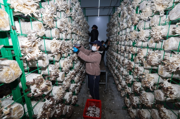 图为10月25日,村民在玲珑街道双源村的鼎新农业基地食用菌共富工坊采收秀珍菇。该农业基地以培育、种植食用菌为主,为当地提供就业岗位60余个。