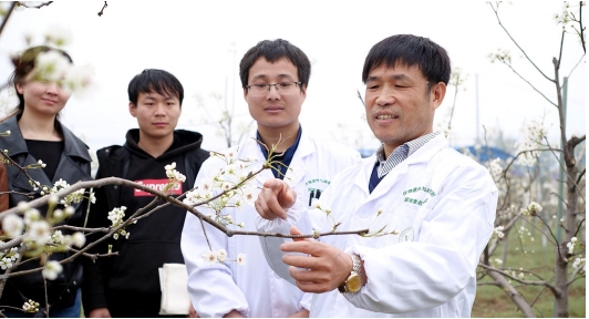 针对这一问题,张绍铃带领团队围绕梨生殖生理与细胞生物学研究,开展了一系列实验研究和田间试验,最终提出了一套有效的“梨树液体授粉技术”。这项技术解决了常规果树液体授粉中花粉活力下降快、分散不均匀等诸多实际问题,梨园授粉效率比传统人工点粉提高30倍以上,降低了生产成本。该技术已在全国梨产区推广应用,并入选农业农村部2021年农业主推技术。