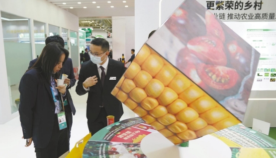 “打造现代农业产业链,让‘田间到舌尖’的距离更短”“用高效稳定的供应链实现高效高质的生产”……11月28日,在北京举办的首届中国国际供应链促进博览会上,各界围绕一个“链”字展开热议。图为参会人员在一家农业科技公司展台咨询。