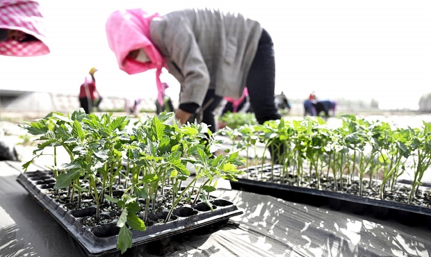 近日,随着天气转暖,宁夏银川市引黄灌区农户紧抓农时,积极投入到春季各项农事生产中,田间地头一派忙碌景象。图为4月16日,在银川市贺兰县常信乡,农户在田间种植小番茄。