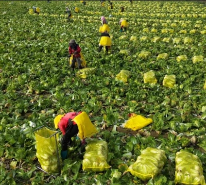 走进山西省朔州市朔城区南榆林乡蔬菜种植基地,连片的娃娃菜叶片肥厚、翠绿鲜嫩。绿油油的田地里,60多位工人正熟练地采收新鲜的娃娃菜,去废叶、装袋、搬运、装车……现场一派热火朝天的劳动场景。