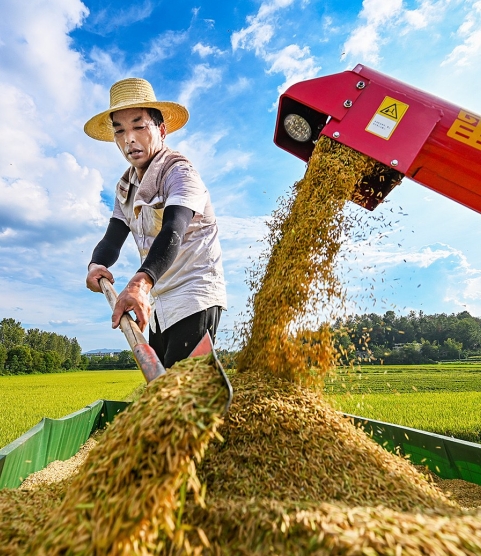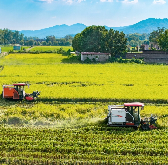 图为罗田县白庙河镇果园场村高标准农田里,水稻陆续成熟,收割机在稻田间来回穿梭,田间地头呈现一派繁忙的丰收景象。