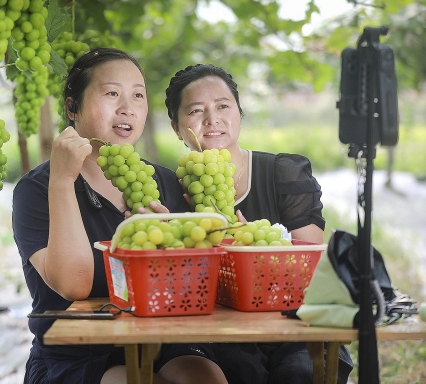 图为近日,农户在直播销售葡萄。