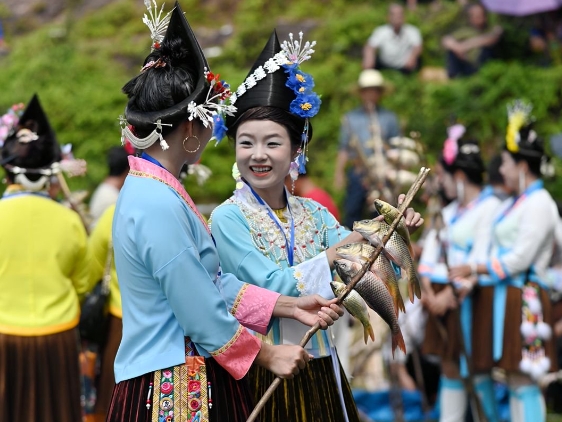 图为苗族姑娘在展示禾花鲤鱼。