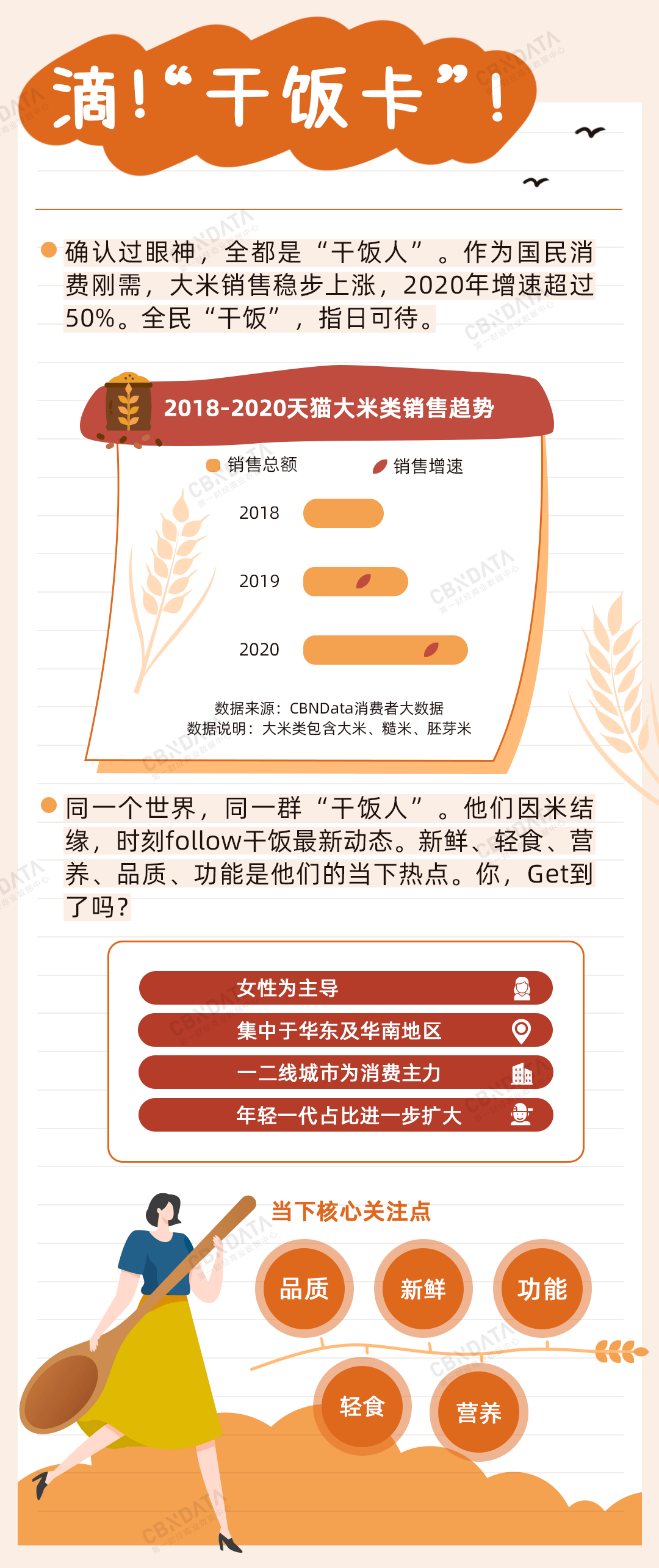 截至2020年,天猫渠道入驻的大米品牌已有2000+个,近两年增加超130%;而在“干饭人”数量增多以及人均消费增长的双重驱动下,整个品类销售总额也逐年增加,2020年的全年增速超过了50%。