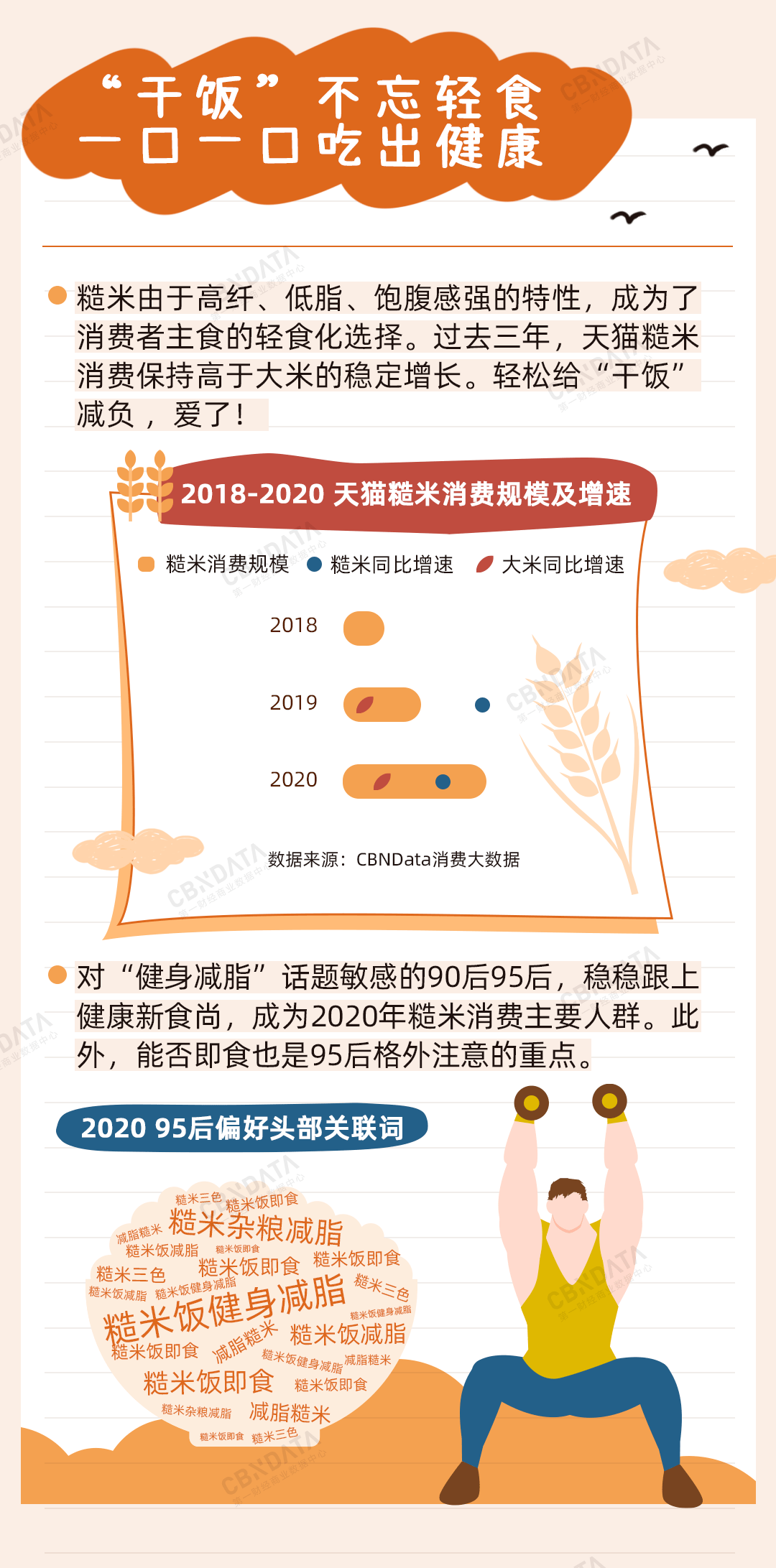 管住嘴迈开腿,自我管理意识占领高地,口腹之欲也只能“靠边站”,“轻食”升级,从主食开始。由于高纤、低脂、饱腹感强的特性,糙米成为了轻食消费者的青睐对象,过去三年,天猫糙米的消费保持高于大米的稳定增长。