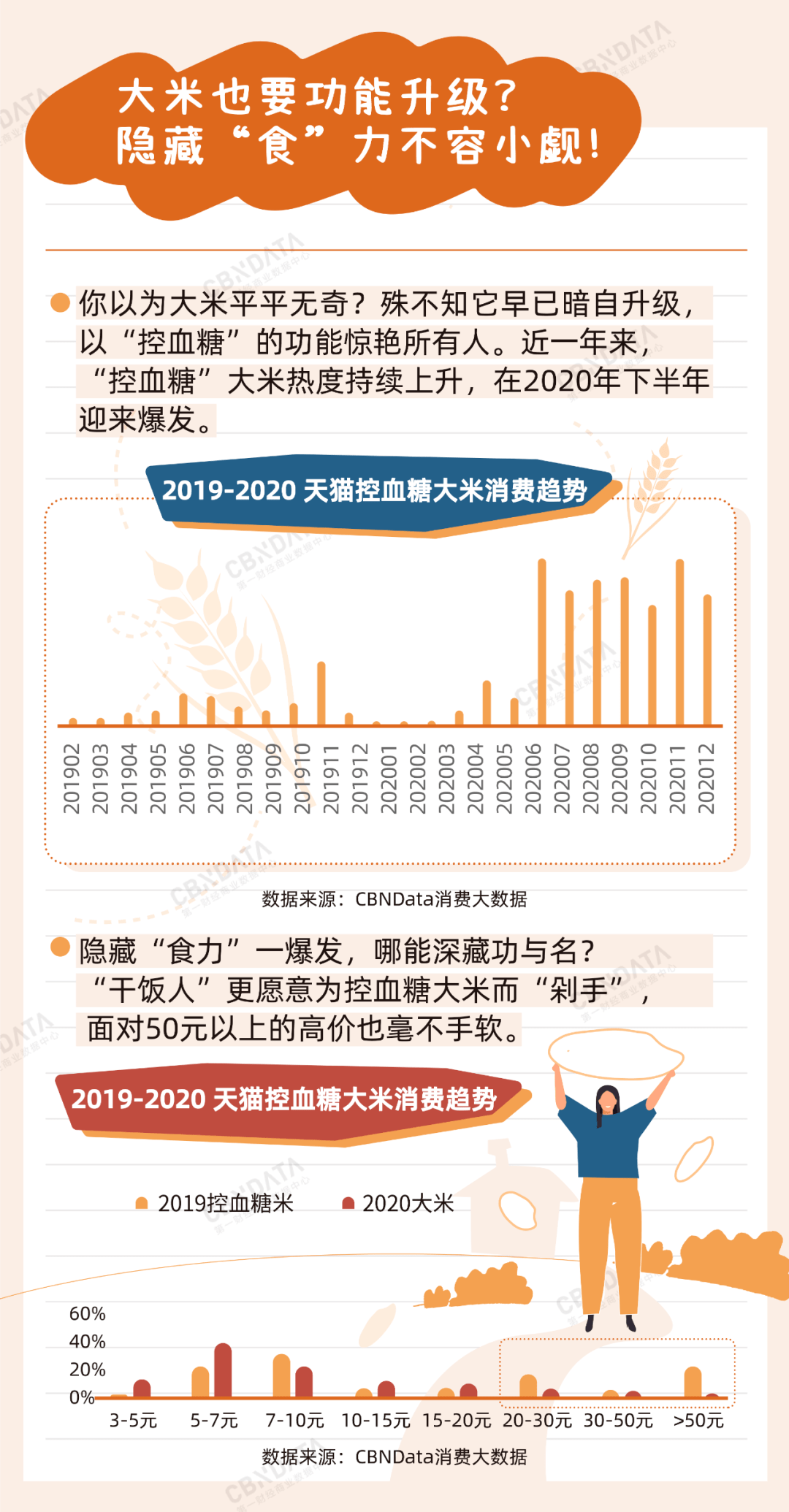 近一年来看,“控血糖”功能大米热度持续上升,其消费在2020年下半年迎来爆发。