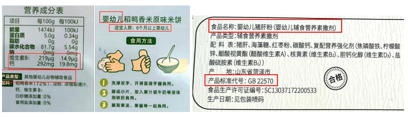 以《婴幼儿谷类辅助食品》(GB 10769)为例,这一标准对产品中的能量、蛋白质、脂肪、部分维生素、钙、铁、锌、钠等营养成分指标都有严格要求。如“爷爷的农场”婴幼儿稻鸭香米米饼产品类别是“其他婴幼儿谷物辅助食品”,标注了维生素B1以及微量元素钙的含量,包装醒目位置处标注“适合6月龄以上婴幼儿”。“海绵宝宝”米饼中的部分产品执行《膨化食品》(GB 17401)标准,产品包装未标注钙、铁、锌、维生素等营养成分的含量,属于普通食品而非婴儿辅食。该标准对婴幼儿生长发育影响关键的蛋白质、脂肪、维生素、钙、铁、锌、钠等营养成分没有强制性要求,且产品不能标注适宜人群。