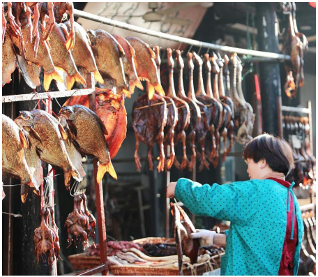 随着春节临近,每个人都充满期待地准备着年货。三年疫情,让餐饮行业付出了巨大代价,疫情放开后的第一波红利,同样最先惠及餐饮行业。酱鸭、鱼干、腊肠作为绍兴人必备的“年味三货”,再次给古镇的商家们带来了巨大商机。放开后,附近过来采买定制腊味的人多了起来,腊味制品一下变得供不应求。作为古镇具有一定规模的松盛酱园,店铺的前后甚至后院都挂满了腊味,忙着晾晒腊味的陈阿姨不停地说生意太好了,春节前再多的腊味都不愁卖,是三年来生意最好的一年。