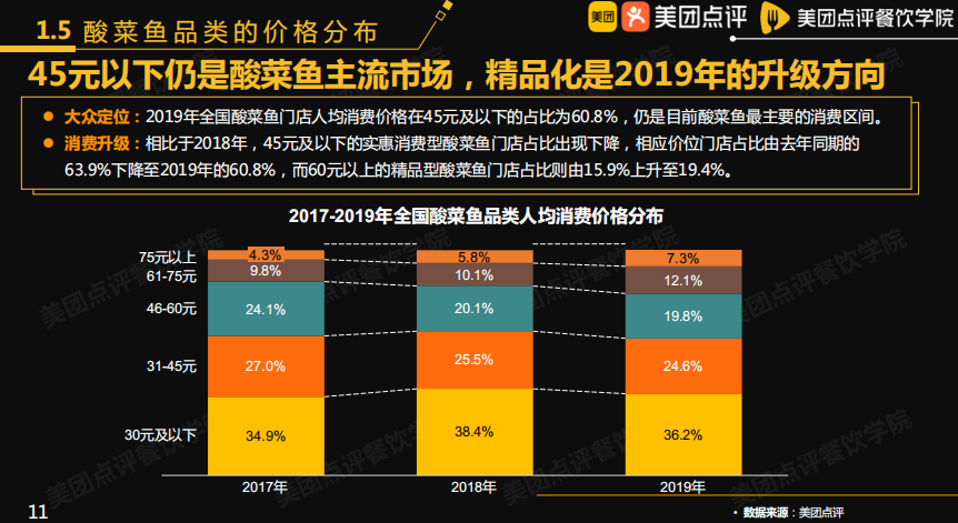 报告中表示,目前酸菜鱼的人均消费价格区间仍集中在45元及以下,占比60.8%。不过相较于2018年,45元及以下的实惠消费型酸菜鱼门店占比出现下降,而60元以上的精品型酸菜鱼门店占比则由15.9%升至19.4%。