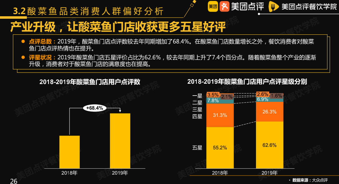 随着酸菜鱼整个产业的不断升级,消费者对酸菜鱼的热情和满意度也在不断攀升。2019年酸菜鱼门店五星好评占比为62.6%,较去年同期上升了7.4个百分点。
