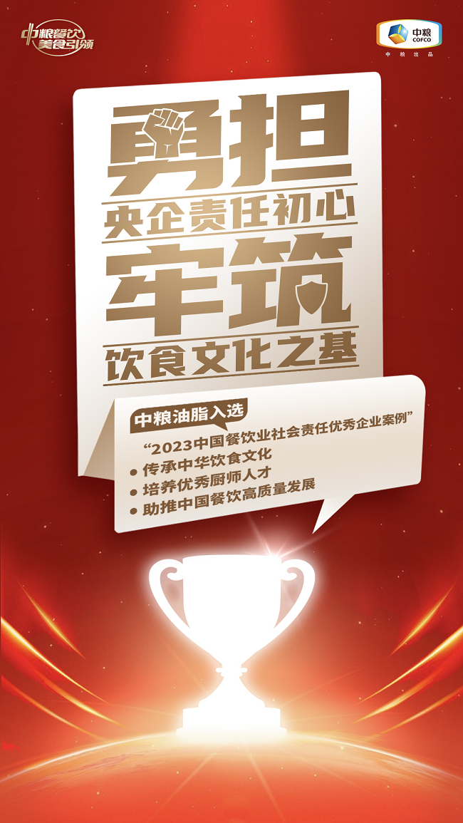 作为国内油脂行业领先者,中粮油脂以匠心产品、良心服务、潜心育人等多维度引领餐饮业品质升级,以全心保障国家粮油安全的使命担当践行社会责任,以传承中华饮食文化诠释央企本色,深受业界好评。在1月10日举办的2024中国餐饮业社会责任大会中,中粮油脂获评“中国餐饮业社会责任优秀企业案例”,展现了其在推动中国餐饮业可持续发展做出的积极努力。站在履行社会责任的战略高度上,中粮油脂始终坚持充分发挥企业社会价值,在新格局下担起福国利民的重任。
