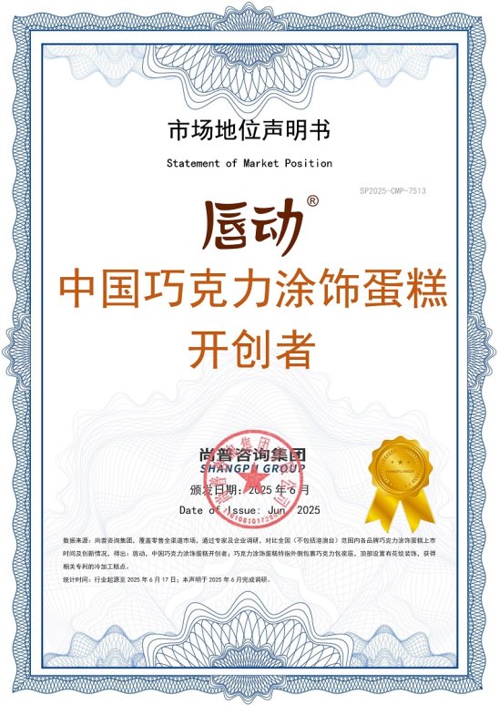 近期,国内权威咨询机构——尚普咨询集团正式向唇动食品股份有限公司颁发四项重磅市场地位声明书,确认该公司在两大核心品类中的开创者地位与销量冠军地位。【唇动,中国巧克力涂饰蛋糕开创者】、【唇动,巧克力涂饰蛋糕全国销量第一】、【唇动,中国奶盖吐司开创者】、【唇动,奶盖吐司全国销量第一】。与此同时,唇动食品经典红丝绒蛋糕凭借卓越品质与独特风味,斩获有“食品界奥斯卡”之称的“国际美味大奖”,为中国烘焙品牌赢得世界级荣誉。