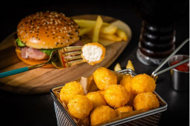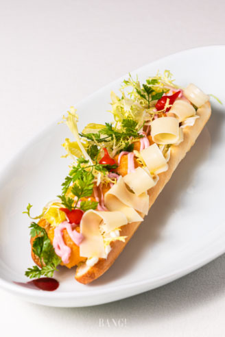 Meatopia自制三明治: 用植基“鳕鱼”球搭配车达芝士、蔬菜等配料,让拥有芝士绵密口感的植基“鳕鱼”球更显质感。