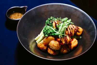 植基鳕鱼球佐黑醋配八色烤时蔬: 资深老饕喜欢的杭帮菜遇上健康新星植基“鳕鱼”球?在位于杭州富春山居度假村的湖廊居餐厅会有不一样的惊喜发现。