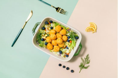 言盐沙拉鳕鱼球: 墨西哥牛油果、荷兰黄瓜、云南奶油生菜等配菜搭配植基“鳕鱼”球,用不同食材碰撞出富有层次的口感体验,满足味蕾的同时又健康轻负担。