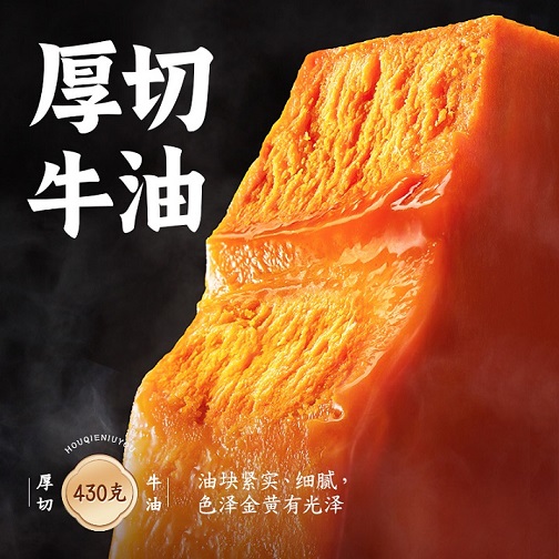 好人家精选品质厚切牛油,430g独立包装,油块紧实、细腻,色泽金黄油亮,在锅中化开瞬间脂香四溢,越煮越香,优质牛油带来醇厚口感与醇香体验。