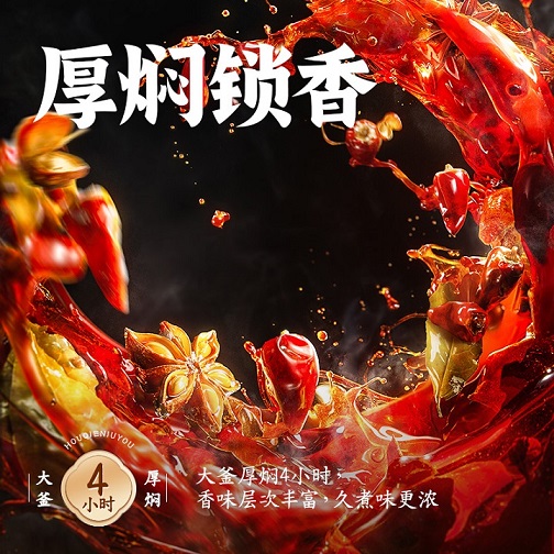 好人家第三代厚火锅底料采用独创“厚焖锁香”工艺,牛油炒制之后,在大釜中厚焖足足4小时。待牛油充分萃取13种精选香辛料风味后,过滤苦味料渣、只取上层红油,让浓郁香味紧锁其中。