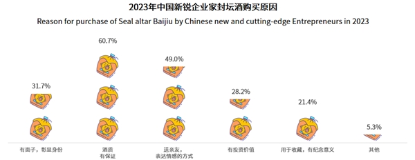 中国自古以来就有着悠久的藏酒历史,不少饮酒人都有藏酒的习惯,但过去只有极少数高端人士有条件定制封坛酒。经调研,超八成的新锐企业家平时有藏酒的习惯,其购买封坛酒的原因是酒质有保证(60.7%)、喜欢封坛的仪式感(59.5%)等。封坛白酒作为高端酒品,其原料及制作工艺要求十分严格,酒体质量有一定的保障。封坛时的仪式感和带来的诸多话题让消费者倍感尊重,彰显了封坛酒的产品价值。