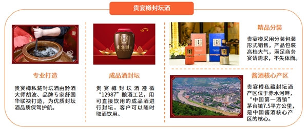 贵宴樽封坛基地立足酱酒核心产区赤水河畔茅台镇,拥有足年年份酱酒基酒、老酒、调味酒,坚持“12987”传统大曲坤沙酿酒工艺,产品由酿酒师和调酒师团队酿造调制。其产品采用分装包装形式销售,满足商务宴请需求。与市面上一般用基酒进行封坛的传统酒企不同,贵宴樽是用可以直接饮用的成品酱香酒进行封坛,封坛后客户可以随时取酒饮用。