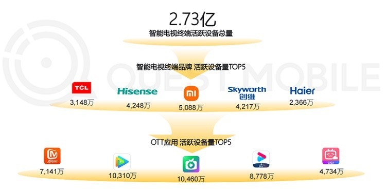 QuestMobile发布的《中国互联网核心趋势年度报告2023》显示,OTT及智能硬件的广告份额不断增长的情况下,在智能电视终端现存2.73亿的活跃设备中,小米OTT以5088万台的活跃设备量拔得头筹。