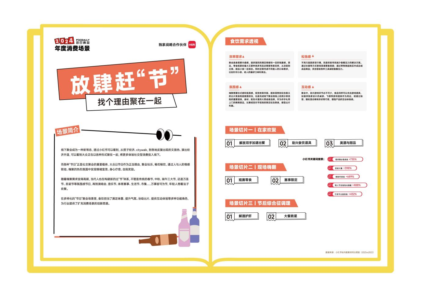3、社交关系的变化带来新的食饮场景需求,当代人在构建新的过节体系,体验型社交消费受到关注,聚会型食品饮料、主题定制型食品饮料会逐渐成为趋势,如在小红书,”看球赛必备美食“搜索关键词增长735%。此外,传统的送礼文化伴随着更多年轻人成为主力人群,在人际交往、情感表达方面更加日常化,而食品饮料是表达日常新意的重要载体,一些具备新奇特、健康感、文化认同感的品类,如烘焙点心、土特产等,成为新兴送礼品类。