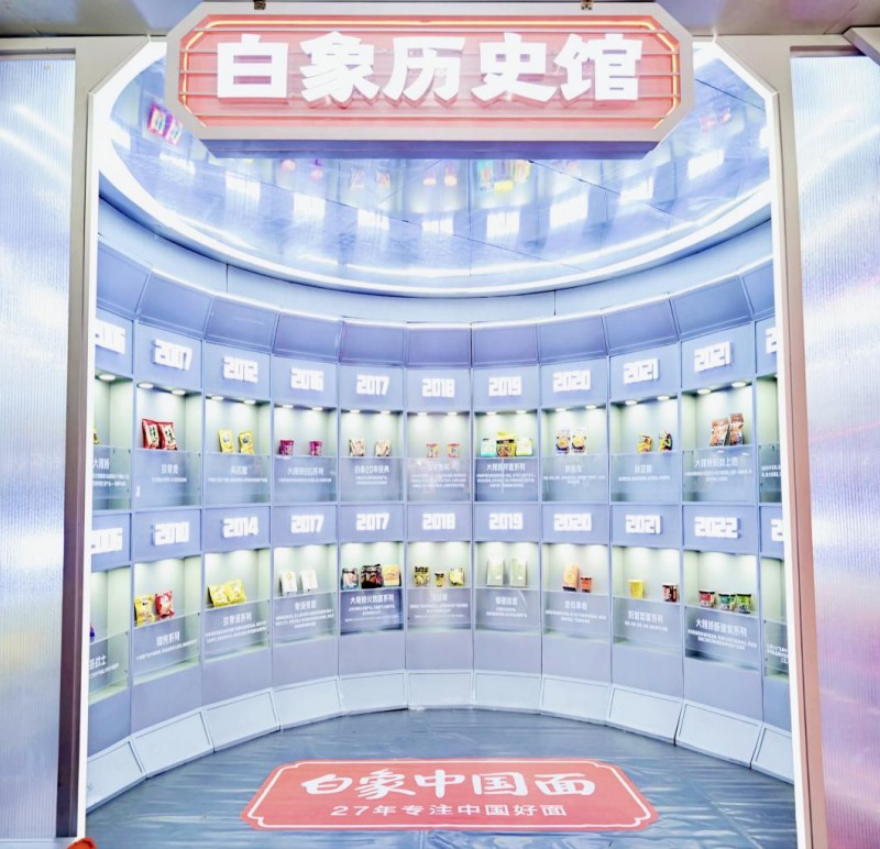 “白象历史馆”则采用270°沉浸式环绕设计,展示白象27年来的经典产品:汤好喝老母鸡汤面、白象大辣娇麻辣小龙虾拌面、白象大辣娇火锅面、蟹黄面和香菜面等等。白象的产品创新,从未停止!