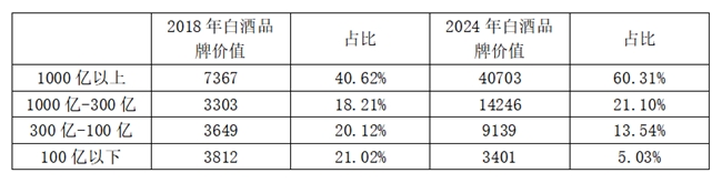 白酒内部同样呈现马太效应。腰腿部的300亿-100亿元(本文品牌价值皆为人民币亿元,下同)、100亿以下区间白酒,相比2018年占比明显下降,1000亿-300亿次高端白酒,占比微弱提升。提升最大的是头部白酒,占比从40%提升至60.31%!