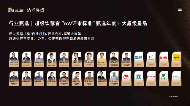 在这场饮品界的“巴黎时装周”上,我们将以“发现真正好饮品”为使命,邀请数据机构、消费达人、行业专家、渠道大商等组成大会超级饮荐官,面向全国甄选潜在现象级超级星品TOP10。2025年度潜在现象级超级星品Top10品牌,将由组委会授予2025中国饮品超级星品证书。