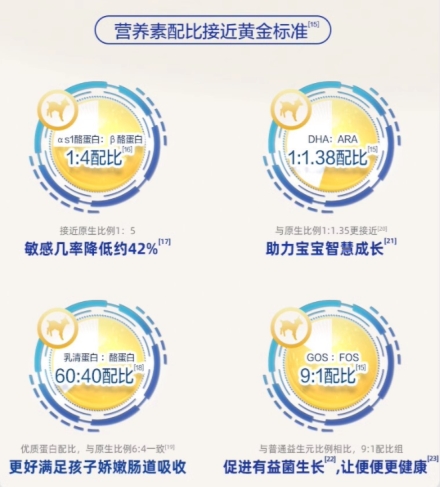 当妈妈们深入了解佳贝艾特悦白羊奶粉后,就会发现它就像一座蕴藏丰富的营养宝库。以山羊奶本身含有的 388 种天然营养素为基础,经科学配比,优化奶粉配方,汇聚了专利OPO、168亿活性益生菌、优量DHA等41种配方营养成分,为宝宝提供全方位的营养守护。而且悦白使用的山羊乳乳清蛋白:酪蛋白的配比为60:40,与原生营养 6:4 的黄金比例相符,更契合宝宝娇嫩肠胃的吸收需求;配方的益生元 GOS 与 FOS 以 9:1 的科学配比组合,有助促进有益菌生长,帮助维持良好的肠道微生态环境,科学保护肠道活力,降低便秘发生风险。
