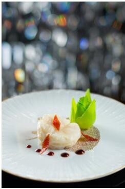 图片四:水晶虎虾球创新选用风干52个月的西班牙伊比利亚火腿,搭配融入了25年陈酿意大利黑醋的自制蚝汁,中西合璧,风味一流。