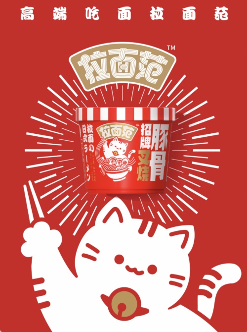 拉面范品牌邀请业界顶尖设计团队潘虎工作室操刀包装设计,第一眼视觉为强烈的色彩对撞,给人以“先声夺人”之感,终端陈列势必吸睛。包装应用了“金字招牌LOGO+招财猫IP”的元素,同时包装的部分图文应用了浮刻技术,充满年轻时尚感以及趣味性,通过设计的力量与视觉的表现,让用户感受到“温暖、治愈、创新”的感受,一举打破该行业包装设计风格的传统模板,以视觉创意这一最直接、最真诚的表达方式与年轻人开展对话。用户在品尝拉面的过程中,会通过视觉传达带来的心理暗示,体验到真实场景的氛围,相比速食行业传统的实物设计风格,更多了一层感情连接。