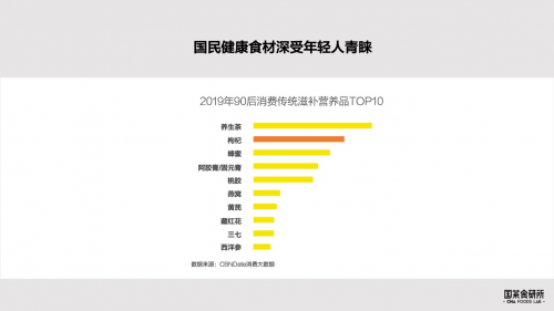 伴随着国潮的兴起,国民健康食材深受年轻人的青睐。一项数据显示,2019年90后消费传统滋补营养品TOP3分别是养生茶,枸杞和蜂蜜。挖掘国民健康食材这座宝藏,或将成就下一个爆款产品。