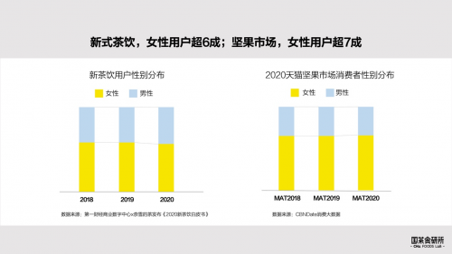 女性消费市场体量庞大,涵盖母婴、女性健康、美容、生鲜等全方位范畴。中国20-60岁女性有4亿,撬动10万亿的女性消费市场。从用户性别结构来看,新茶饮女性用户超6成,坚果市场女性用户超7成,占绝对的主导地位。女性也是家庭消费的主要决策者,把握住一个女性的需求,相当于掌握了这一家的消费走向。