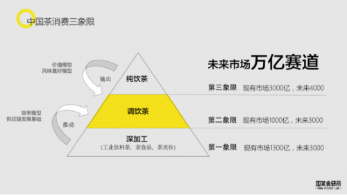 罗军将中国茶消费市场分为“深加工”、“调饮茶”、“纯饮茶”三个象限,整个茶市未来将进入万亿赛道。