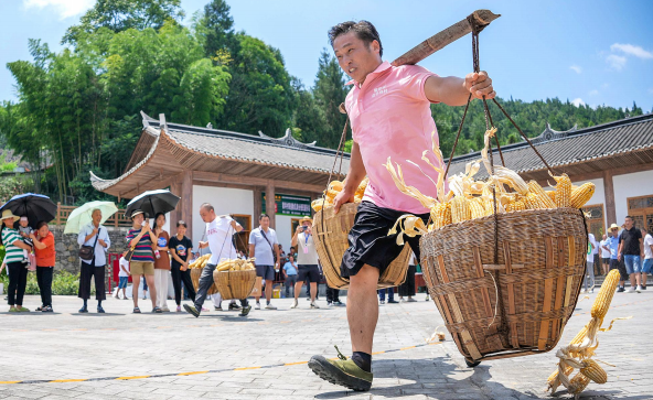 图为村民在景区趣味运动会上参加挑玉米比赛。