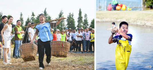 图①为农民趣味运动会现场,图②为小朋友体验稻田抓鱼。