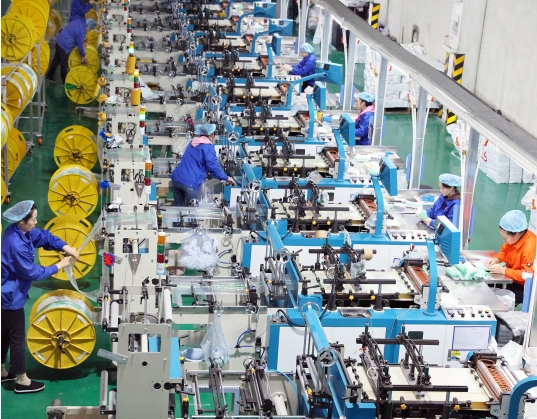 图为3月26日,在浙江省湖州市德清县乾元镇的一家塑料制品公司生产车间,工人在赶制出口的食品保鲜袋订单。
