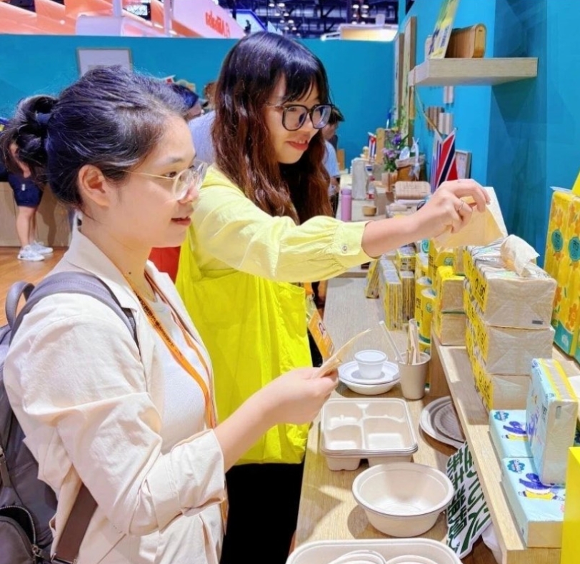 在国际竹藤组织展厅内,竹制餐盒、纸巾、笋干、笋米等竹产品吸引了众多观众驻足。