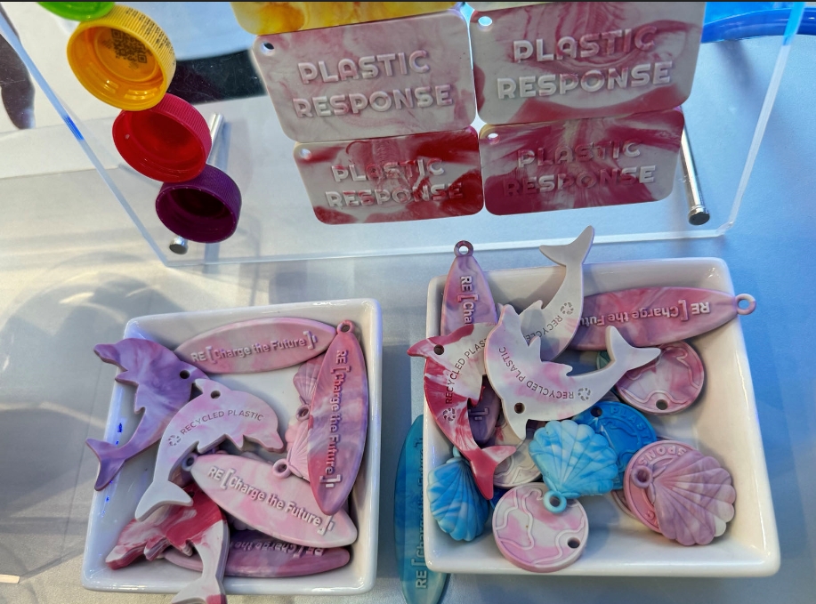 “像这样一个钥匙扣,其实是用塑料瓶盖做成的,大概可减少17克的碳排放,我们还引入了NFC版本,轻贴手机就能识别相关内容。”中国太保展区工作人员介绍,将回收到的瓶盖粉碎后,放入在桌面再生立式机中,经过热熔挤压,经由模具塑形就可以得到海龟、贝壳、海豚等各式各样的钥匙扣。“我们希望借助这样的活动,让观众了解到废弃塑料也不是‘一无是处’。”据悉,服贸会期间共消耗废弃瓶盖6000余枚,相当于减少20公斤二氧化碳排放。
