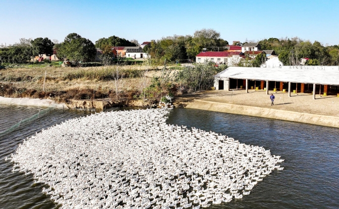 图为日前,庐江县郭河镇养鹅大户的2000多只白鹅正进入水塘。