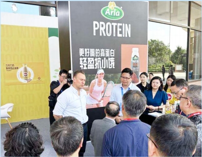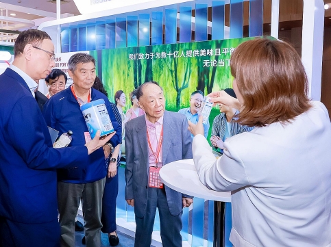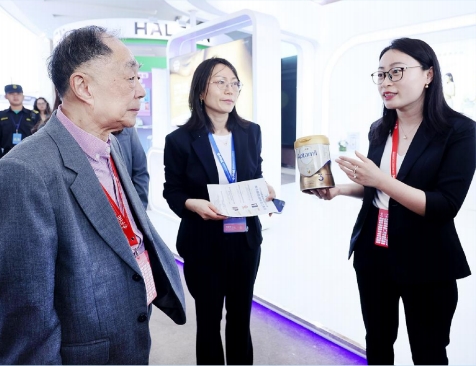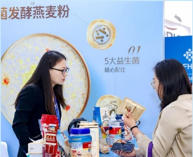 FHE2025期间,与会专家在展会现场了解3D脂球配方粉、N3亲体奶、蒸糯即食燕麦片、乳清蛋白、甘油二酯油等健康食品。