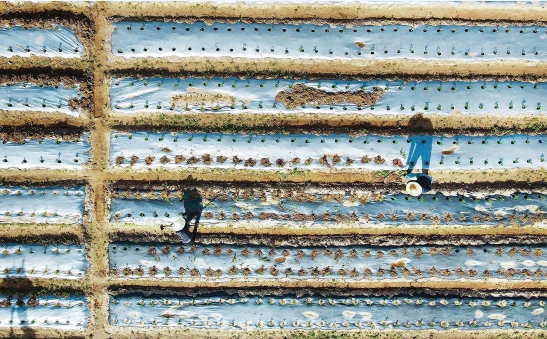 图为日前,在岳西县毛尖山蔬菜种植基地,村民正在移栽辣椒苗、给地膜覆土加固。