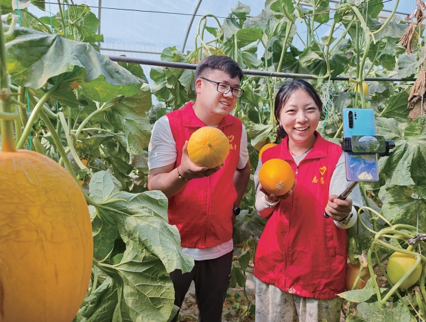 图为近日在阿瓦提县阿瓦提镇团结社区温室大棚里,党员干部通过直播带货方式帮助果农销售金丝甜瓜。